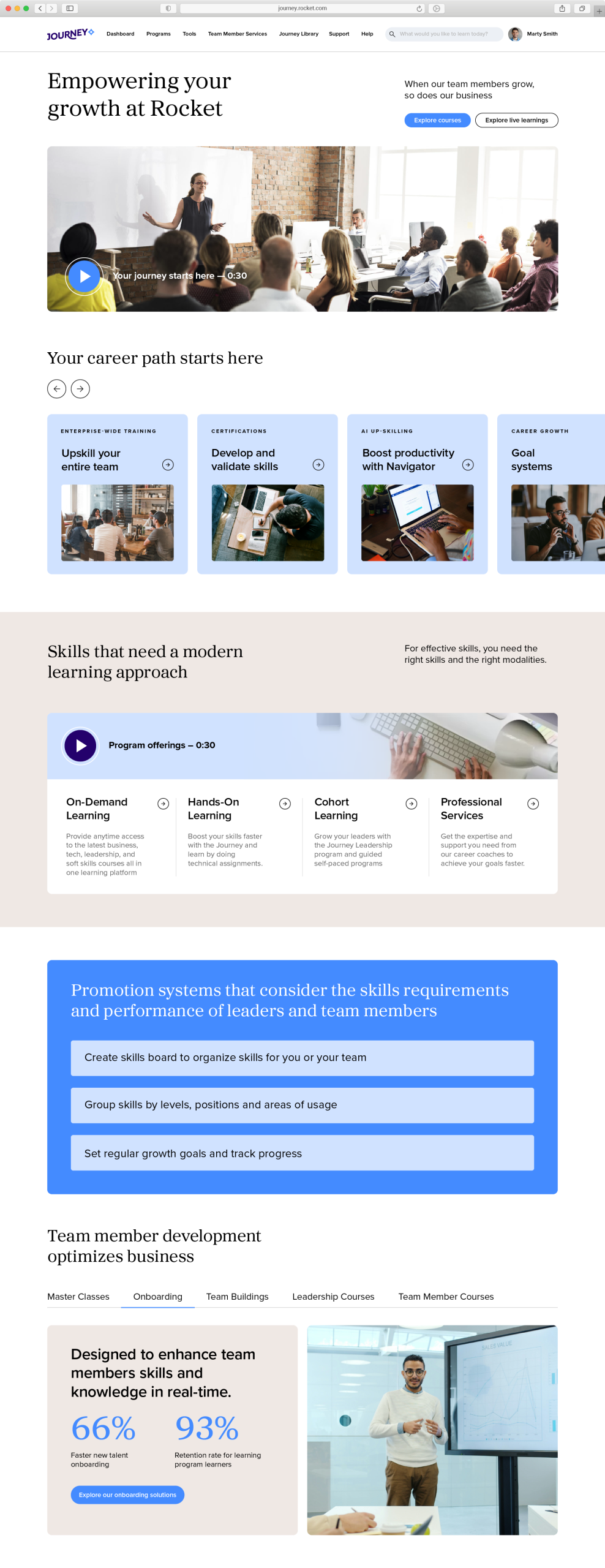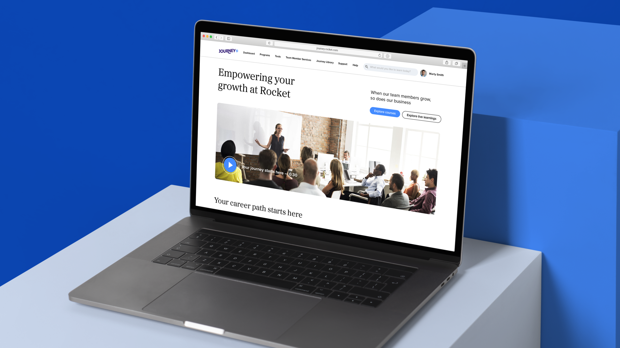 The Journey is a platform that offers internal and external learning and educational opportunities related to career growth for team members and leaders within Rocket. It’s comprised of a variety of courses, programs, soft skills training and resources specific to business areas within the organization.